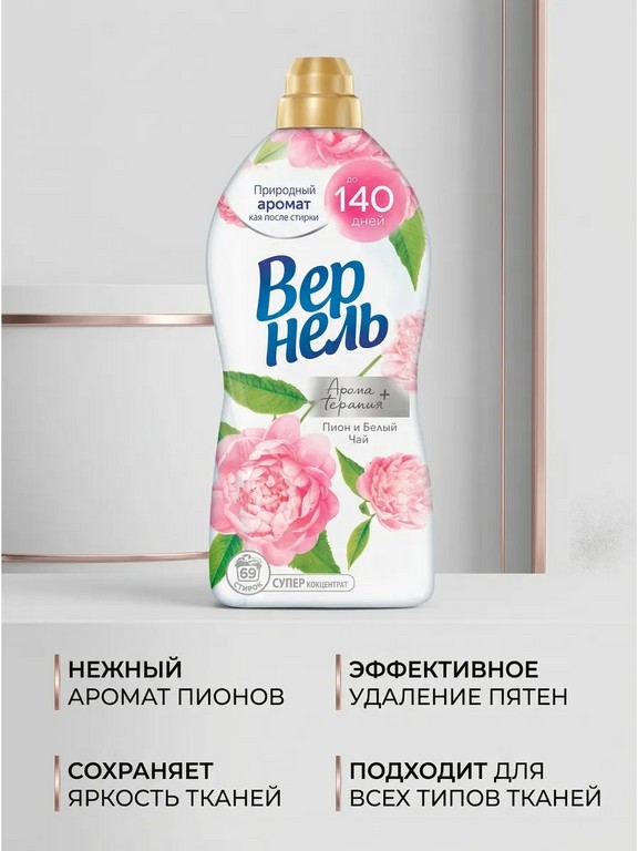 Концентрированный кондиционер для белья Вернель Ароматерапия Пион и белый Чай 1740 мл (69 стирок) подарит Вашему белью не только невероятную мягкость, но и магический аромат лотоса, а благодаря специальным аромакапсулам в составе кондиционер для стирки Вернель позволит наслаждаться интенсивным ароматом белья до 140 дней (при хранении белья без использования). Концентрированный кондиционер Вернель содержит в составе эфирные масли, дарящие вдохновение для души и тела. Кондиционер Вернель придает приятный аромат и мягкость белью. Кондиционер Вернель облегчает глажку и обладает антистатическим эффектом. На одну стирку достаточно меньше половины колпачка концентрированного кондиционера. Кондиционер Вернель подходит для всех видов тканей. Избегайте непосредственного контакта средства для стирки с тканью.