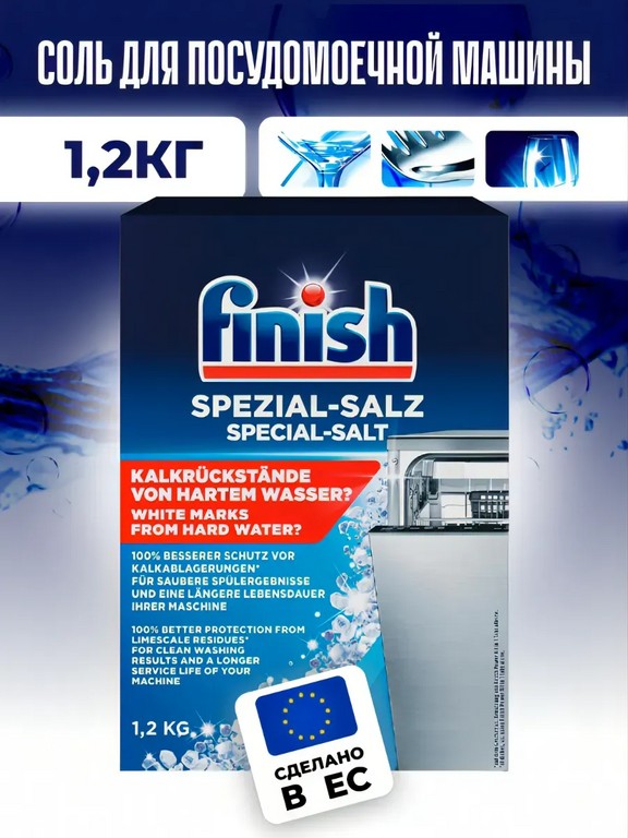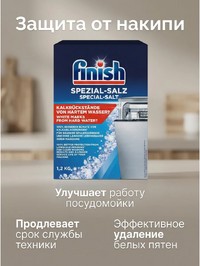FINISH Соль специальная гранулированная для посудомоечных машин 1,2 кг. Соль Finish улучшает работу посудомоечной машины, смягчает воду, защищает от накипи, устраняет подтеки, предотвращает образование известкового налета. Отложение извести могут отразиться на эффективности работы вашей посудомоечной машины. Соль Финиш имеет пять мощных функций и состоит из чистой соли, специально гранулированной для использования в посудомоечной машине. Очищенная соль гарантирует эффективность работы блока смягчения воды, обеспечивающего защиту Вашей посудомоечной машины от известкового налета, что также помогает предотвратить образование пятен и водных подтеков на вашей посуде.