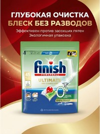 Финиш Ультимейт все в одном для посудомойки заботится о чистоте кухонных и столовых принадлежностей. Бесфосфатные таблетки для ПММ все в 1 защищают фильтры и другие скрытые части машины, предотвращают оседание известкового налета и каменных отложений. Работают даже в эко - цикле, при низких температурах и не оставляют разводов. Глубоко распределяют очищающие ферменты, удаляя жир и остатки пищи. Не содержат фосфатов, хлорного отбеливателя и консервантов. Не требует предварительного замачивания. Водорастворимая оболочка. Не трогайте капсулу мокрыми руками. Поместите продукт в сухой отсек для моющего средства, чтобы капсула не растворилась до того, как начнется моющий процесс. Для наилучшего результата выбирайте температурный режим 50-55 °С или авто.